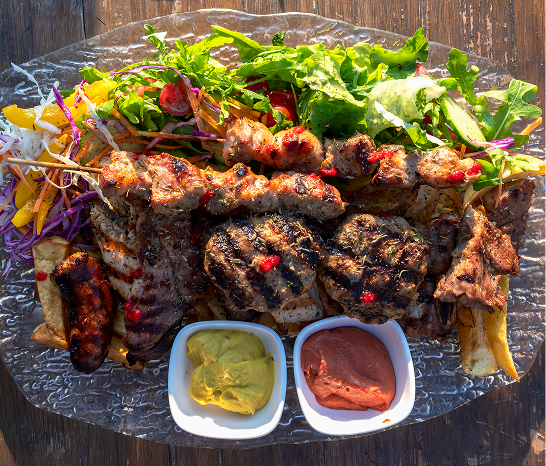 Served with your choice of Rice, or Cabbage or Salad and 1 side and large with 2 sides
